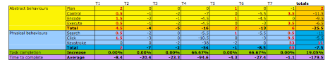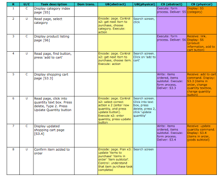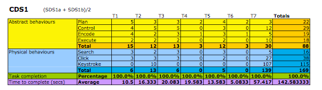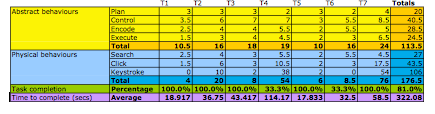 The costs matrix is constructed by listing the user abstract and physical behaviours on the y axis and tasks on the x axis. The cells of the matrix are instantiated by analysis of user data in the task goal structure. The cumulative abstract and physical costs are represented separately, as it is assumed that there is no equivalence in cost between an abstract and a physical behaviour. The costs matrix is also used to collate measurement of task quality, measured in terms of task completion rates, and time taken to complete each task.