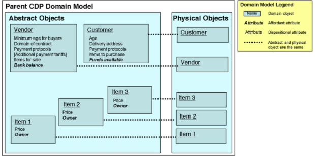 The affordant domain attributes (shown in bold in the domain model) are changed by the worksystem, in order to achieve the Product Goal. The dispositional domain attributes must have the values specified in the Product Goal, in order for it to be possible for the work to be done. The class domain model does not contain specific values for the object attribute values. The requirements for the object attribute values are specified in the Product Goal. The Product Goal (termed ‘CDP1-PG’) specifies the required values for the dispositional domain object attributes, and a specification of the affordant domain attribute value transformations that comprise the work.