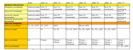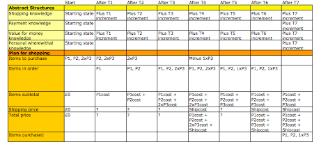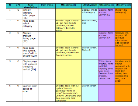 Runtime costs were calculated using the Costs Matrix, one of which was constructed for each user interacting with each SDP. The matrix was completed by giving a score of 1 for every observed or inferred user behaviour. The mean values for users were then calculated (shown in Table 5). Costs support diagnosis of ineffectiveness in the SDPs, and enable comparison with potential design solutions. The tasks in Table 1 constitute the TGS to achieve the product goal. Similar tasks were used during evaluation of the CDS, to support direct comparison of performance. Tasks 1-3 involved ordering goods; Tasks 4 & 6 were ‘find total price’; Task 5 was ‘delete items’; and Task 7 was ‘complete transaction’.