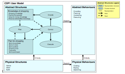 The process structures in CDP1-U support abstract behaviours, which are defined as ‘planning’, ‘controlling’, ‘perceiving’ and ‘executing’. The abstract structures in CDP1-U are embodied by its physical structures, which also support physical behaviours, i.e. ‘clicking’, ‘keying’, and ‘searching’.