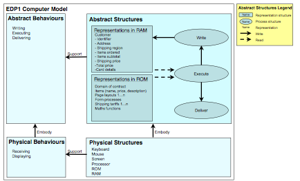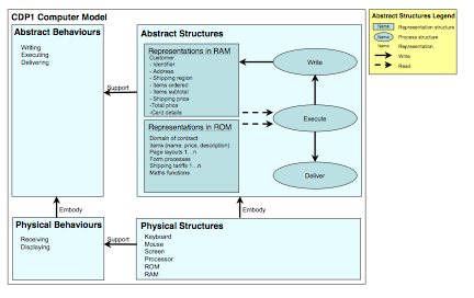 CDP1-C, like CDP1-U, comprises both representation structures and process structures, which support abstract behaviours. The abstract structures are embodied by physical structures, e.g. memory, processors, which support physical behaviours.