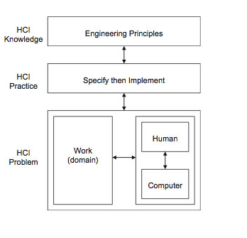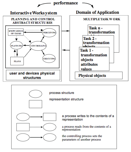 The Dowell and Long (1989) HCI conception is well described here. However, it is worth noting that: (1) interactions perform tasks with some degree of effectiveness, not just perform them; (2) domain objects are physical or physical and abstract, rather than physical or abstract; (3) at least some domain object attributes are necessarily mutable (otherwise no ‘work’ can be performed, that is, no object attribute transformations can be made by the interactive worksystem); (4) structures are physical or physical and abstract, rather than physical or abstract (as indeed are domain objects – see (2) earlier.