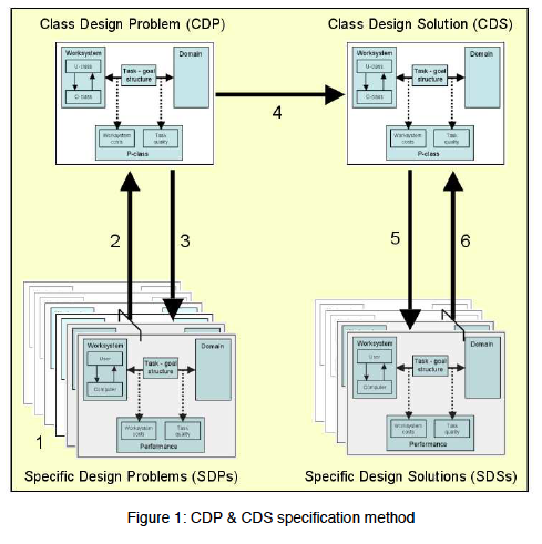First, a promising class of systems is identified on the basis of (informal) similarities in work performed. Second, examples of such systems are selected for testing. If these systems achieve a desired level of performance, they constitute specific design solutions (SDSs). If Pa ≠ Pd, they constitute specific design problems (SDPs). The SDP representations specify the domain objects, sufficient to characterise the work performed by the IWS, to achieve the product goal by operationalisation of the TGS. The IWS, comprising user and computer models, specifies the structures sufficient to support behaviours, to achieve the TGS. Performance, expressed as Tq and Uc and Cc, is established empirically.
