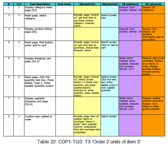 Runtime costs were calculated using the Costs Matrix, one of which was constructed for each user interacting with each SDP. The matrix was completed by giving a score of 1 for every observed or inferred user behaviour. The mean values for users were then calculated (shown in Table 5). Costs support diagnosis of ineffectiveness in the SDPs, and enable comparison with potential design solutions. The tasks in Table 1 constitute the TGS to achieve the product goal. Similar tasks were used during evaluation of the CDS, to support direct comparison of performance. Tasks 1-3 involved ordering goods; Tasks 4 & 6 were ‘find total price’; Task 5 was ‘delete items’; and Task 7 was ‘complete transaction’.